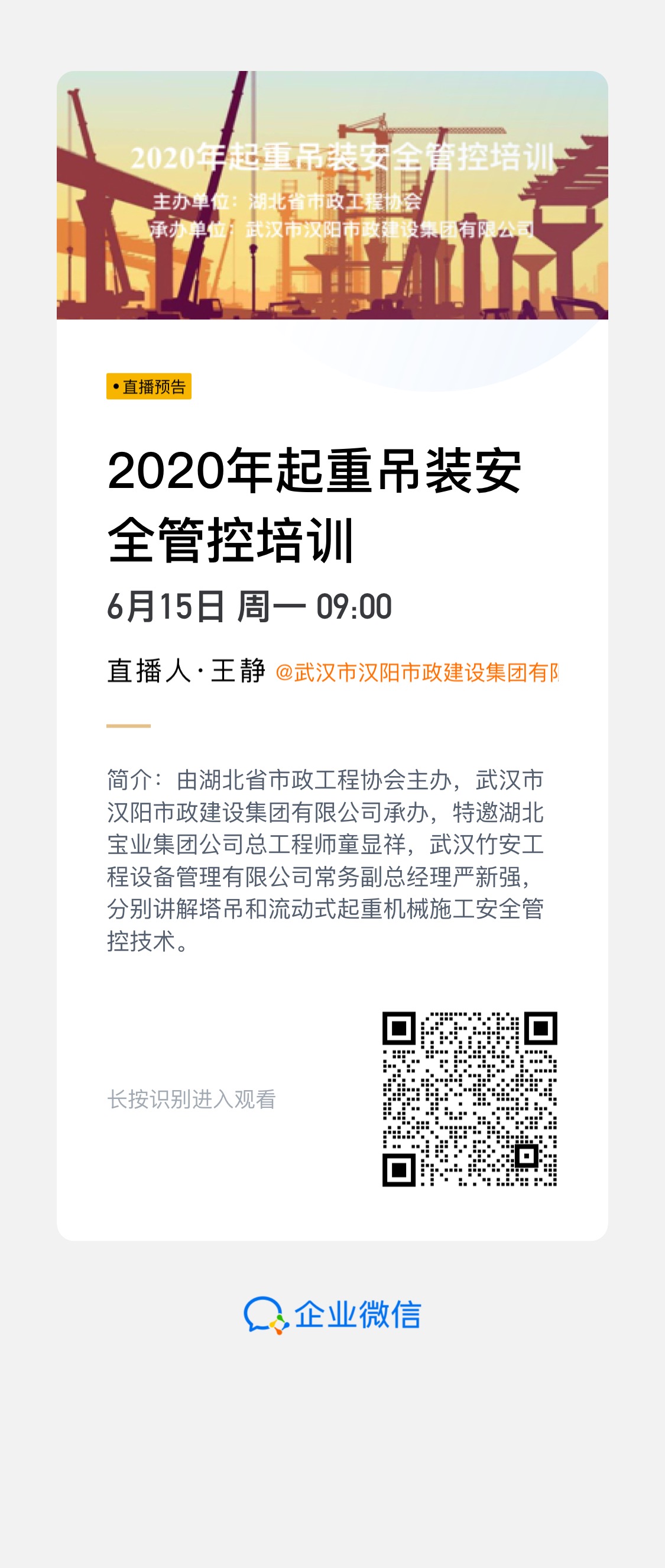 ? ? ? 培訓(xùn)采用現(xiàn)場授課與企業(yè)微信線上同步直播的方式進(jìn)行。線上直播在組織內(nèi)部人員觀看的同時,還通過湖北省市政工程協(xié)會線上平臺,吸引了更多同行管理人員的觀看,累計共有604人次觀看。
