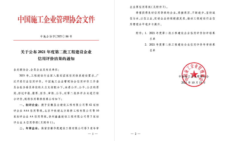 近日,中國施工企業(yè)管理協(xié)會發(fā)布,2021年度第一批、第二批工程建設(shè)企業(yè)信用評價(jià)結(jié)果名單漢陽市政鐘鑫公司、致遠(yuǎn)公司榮獲信用等級AAA級。截止目前,漢陽市政及旗下共有5家企業(yè)獲此榮譽(yù)。