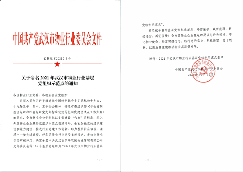近日,中共武漢市物業行業委員會公布《2021年武漢市物業行業基層黨組織示范點名單》,漢陽市政安居興業公司黨支部名列其中。經各區物業行業黨委推薦報送,武漢市物業行業黨委審核評定,全市共有186個基層黨組織被命名為“2021年武漢市物業行業基層黨組織示范點”。