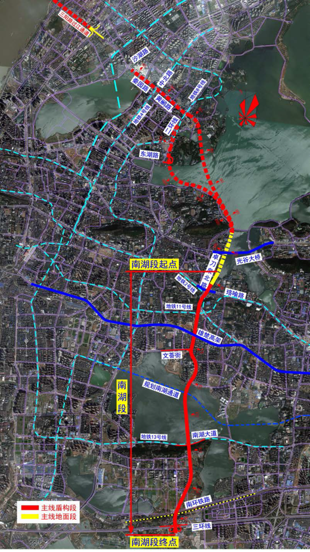 兩湖隧道(南湖段)項目起點位于洪山區卓刀泉北路主線入口,終點位于三環線地下互通南側,采用雙向六車道規模建設,主線長8.015km,設計時速50公里/小時。主體工程為道路、隧道工程,配套工程包括建筑、機電、管線綜合、橋梁、消防、逃生救援、交通安全設施、環境保護、景觀綠化等工程。兩湖隧道(南湖段)是目前國內最長、世界規模最大的城市湖底隧道,也是武漢市首個引入社會資本的雙層超大直徑隧道項目。項目估算金額約109.31億元,合作期24.5年,其中建設期4.5年,運營期20年。