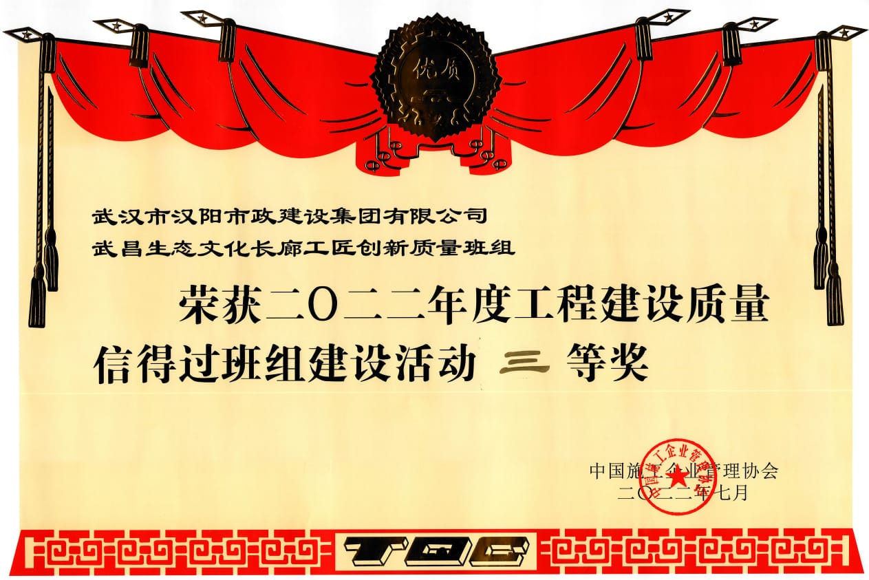 近日,中國施工企業管理協會公布了2022年工程建設優秀質量信得過班組名單,漢陽市政首次參加此類活動,申報的3個成果均獲得獎項。其中,三公司“武漢博宏建設集團有限公司裝修班組”和七公司“當陽沮河一橋實干建設班組”榮獲二等班組獎項;二公司“武昌生態文化長廊工匠創新質量班組”榮獲三等班組獎項。