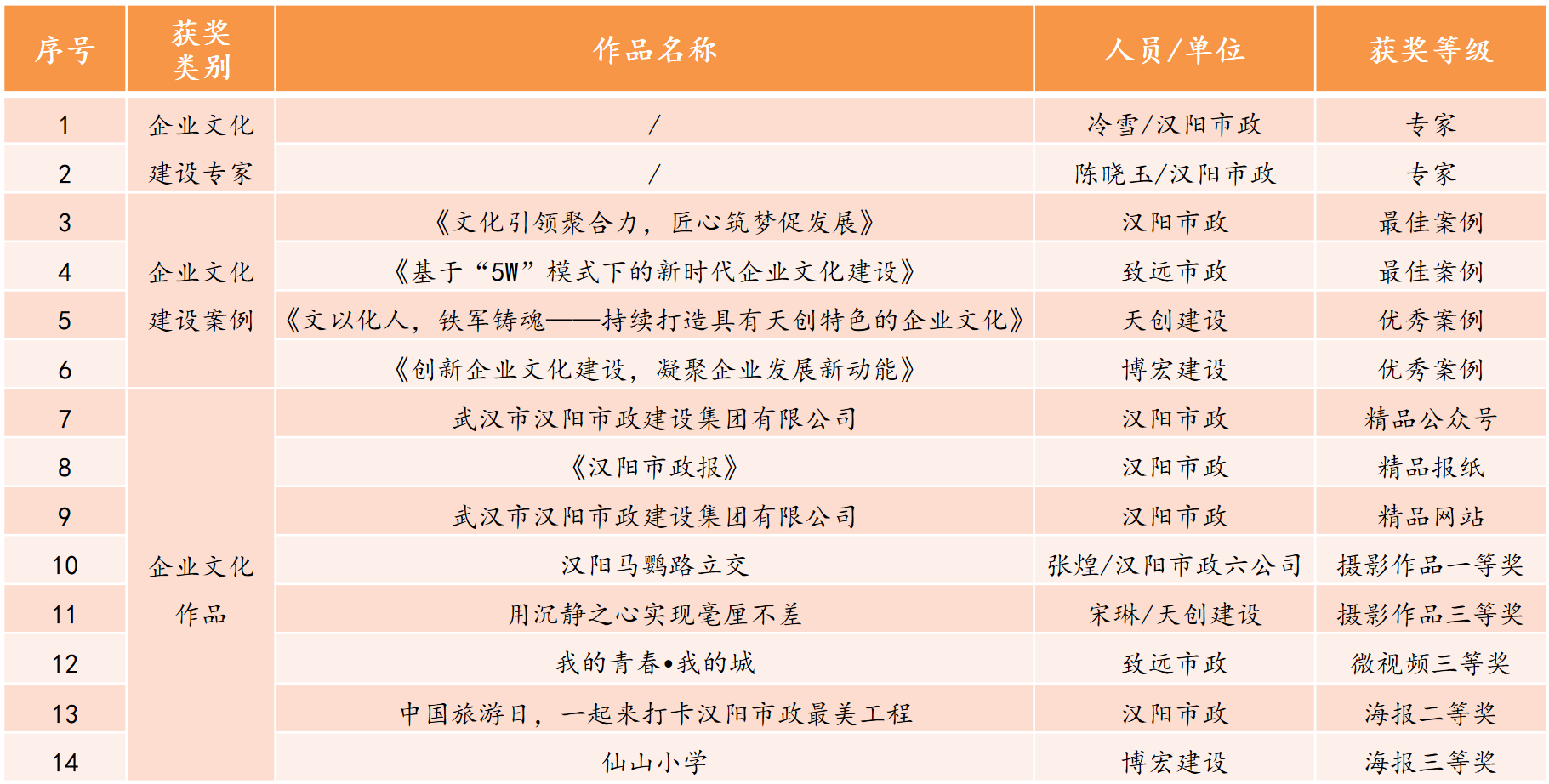 近日,中國(guó)施工企業(yè)管理協(xié)會(huì)發(fā)布《關(guān)于公布第二批工程建設(shè)企業(yè)文化建設(shè)專(zhuān)家的通知》《關(guān)于公布工程建設(shè)企業(yè)文化建設(shè)最佳案例和優(yōu)秀案例的通知》《關(guān)于公布2022年工程建設(shè)企業(yè)文化作品競(jìng)賽結(jié)果的通知》,漢陽(yáng)市政斬獲14項(xiàng)企業(yè)文化建設(shè)類(lèi)榮譽(yù)!