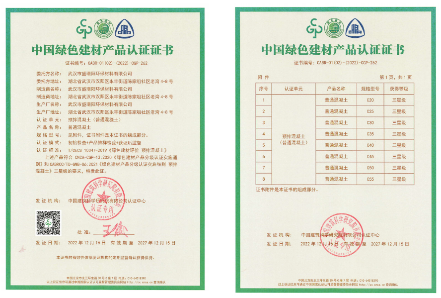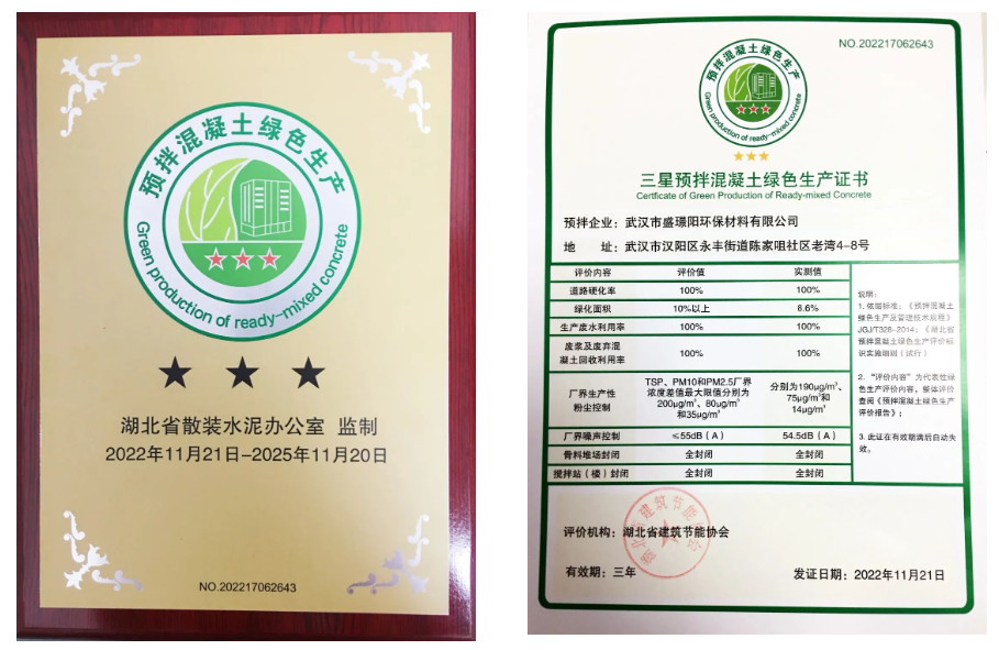 ? ? 近日,喜報傳來,漢陽市政盛璟陽公司順利通過評審程序,相繼取得了“三星預拌混凝土綠色生產評價證書”“綠色建材三星認證證書”,成為一家榮獲“綠色生產+綠色建材”雙三星認證企業。
