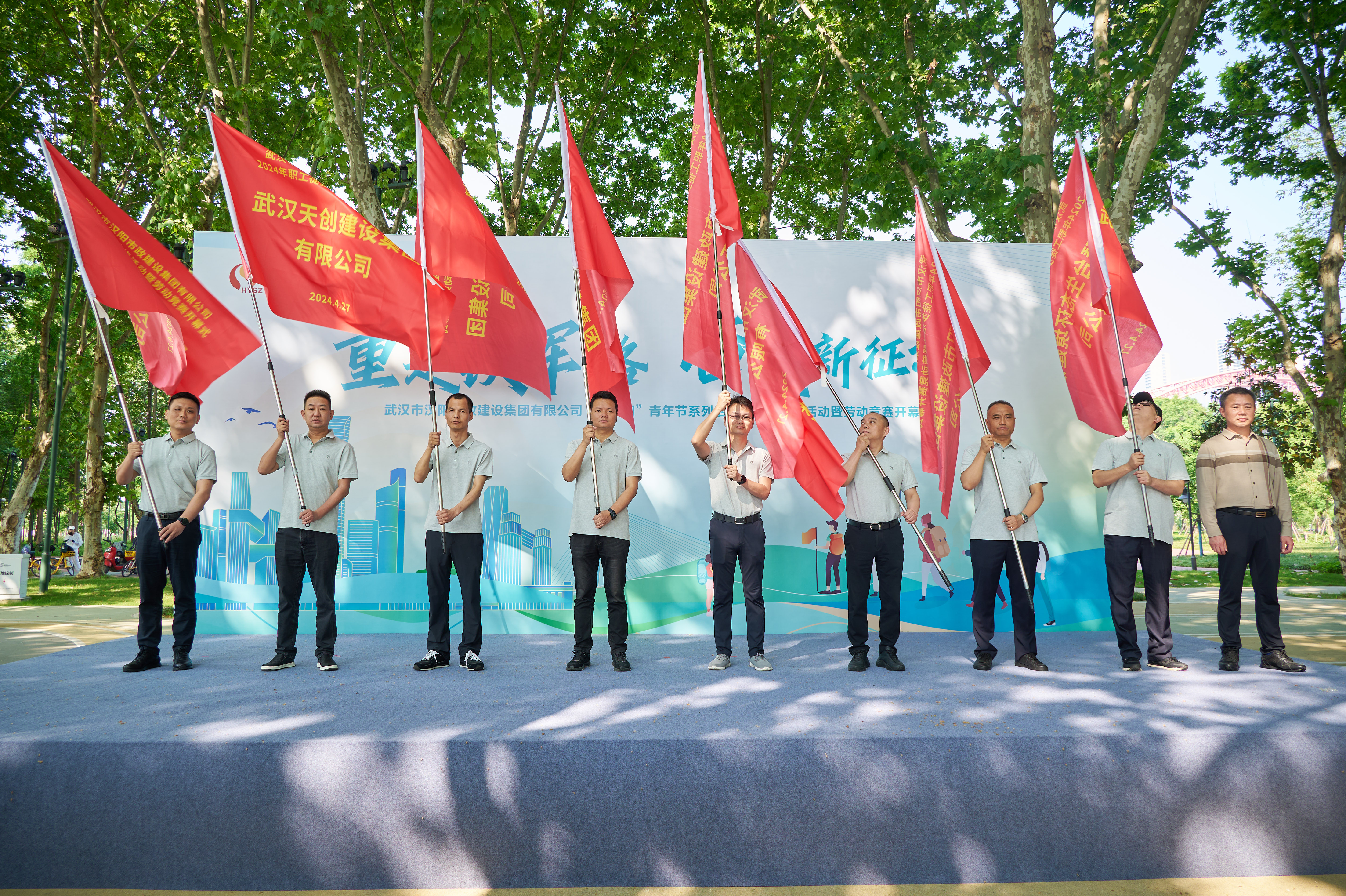 漢陽市政副總經理方紫微、總工程師盧永紅為13家勞動競賽參與單位代表授旗,旗幟高高飄揚,現場氣氛熱烈高漲。