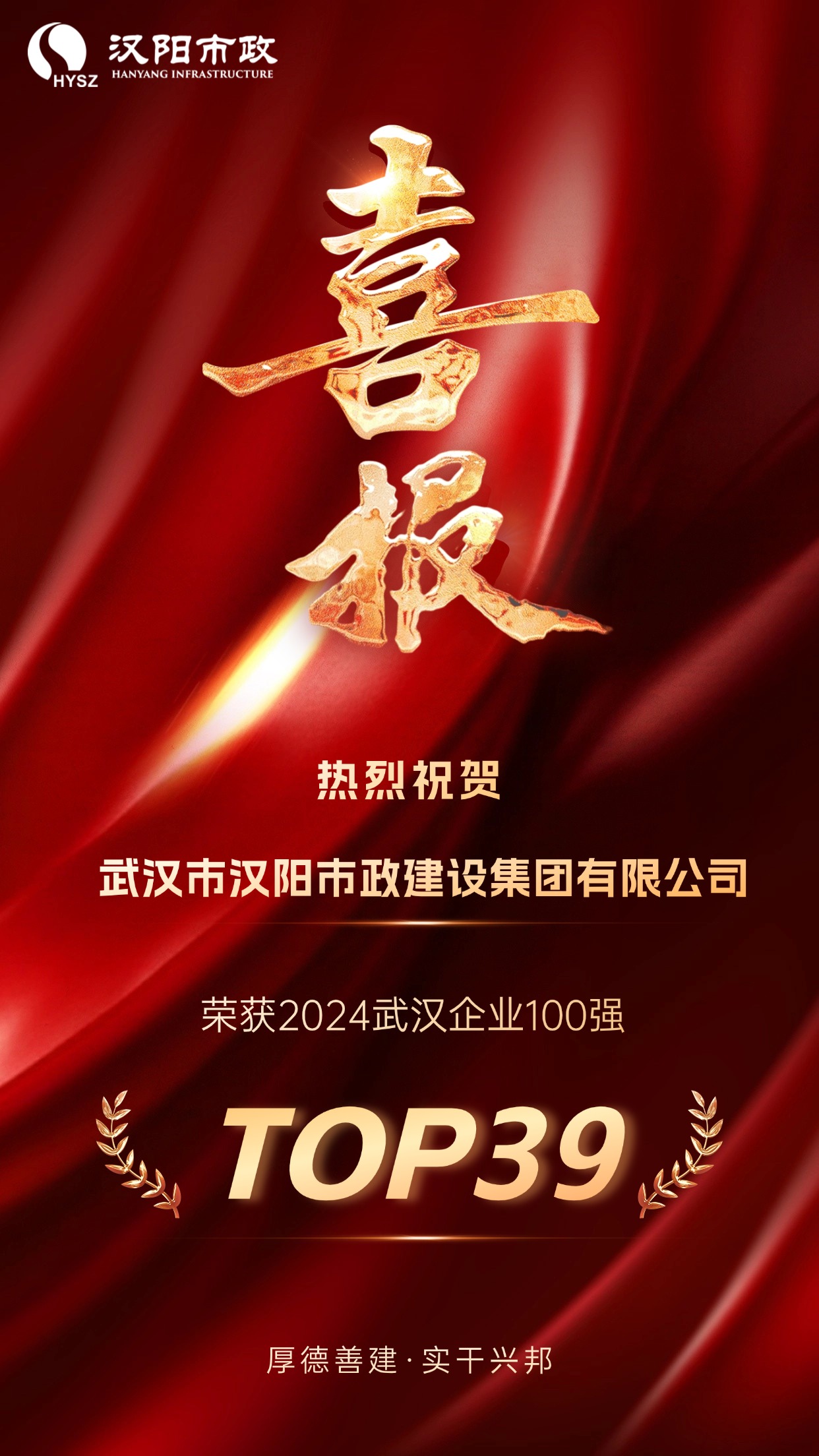 排名公布!漢陽(yáng)市政榮登武漢企業(yè)百?gòu)?qiáng)榜第39位!
