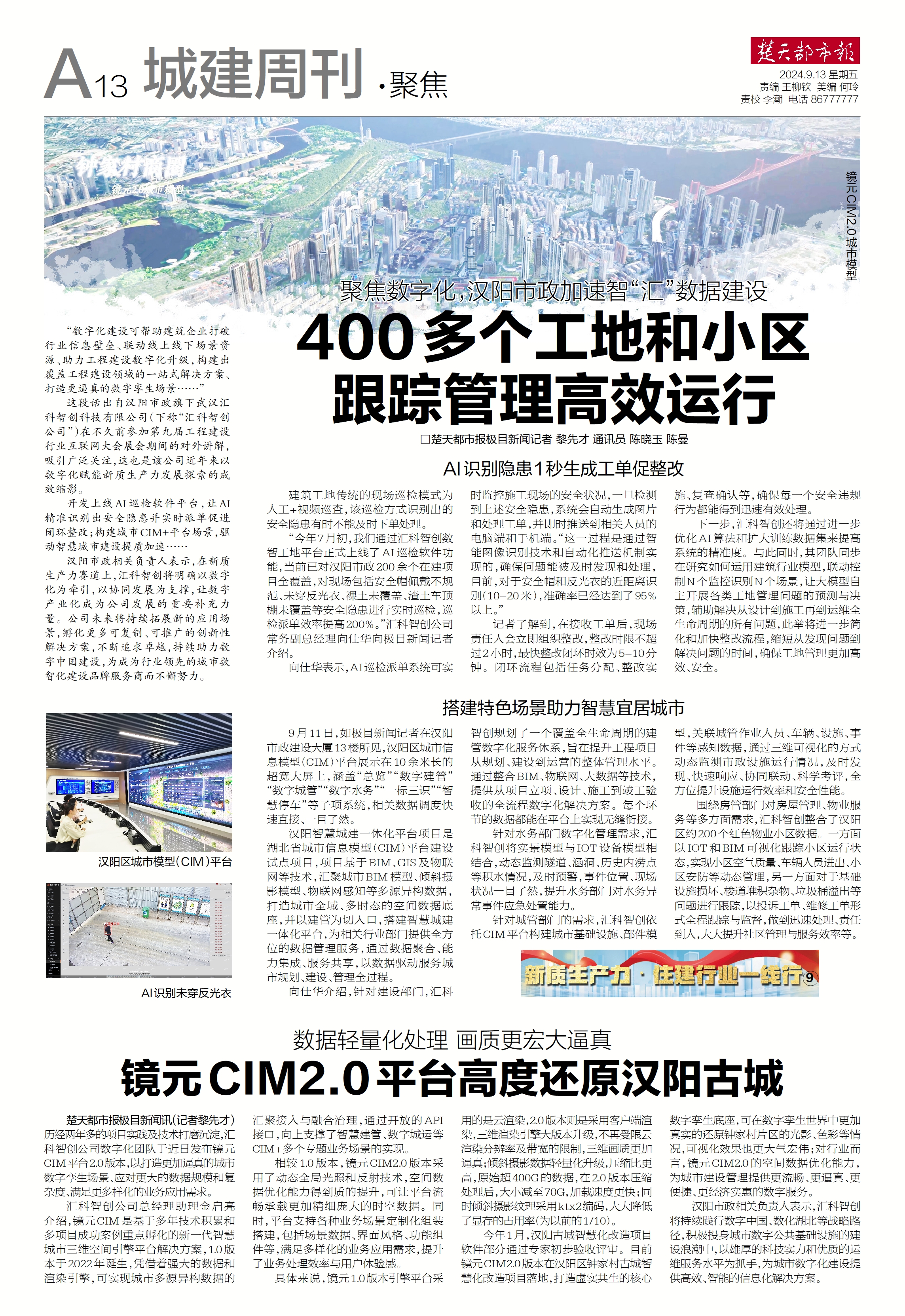 ? ? 楚天都市報推出《聚焦數字化,漢陽市政加速智“匯”數據建設,400多個工地和小區跟蹤管理高效運行》專版報道。